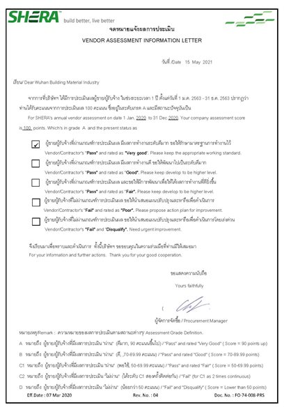 中材節能所屬武漢建材院榮獲泰國Shera集團2020年度供應商年度A級滿分供應商